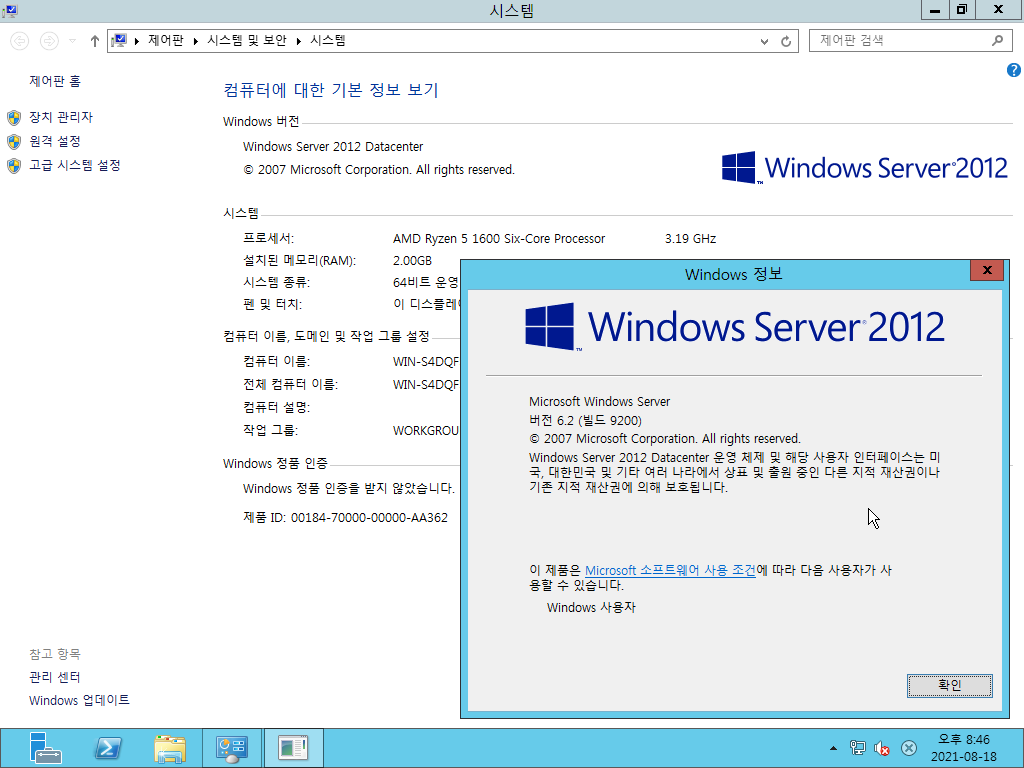 시스템 등록 정보입니다. 윈도우 서버 2012 데이터센터입니다. 빌드 넘버는 6.2.9200입니다.