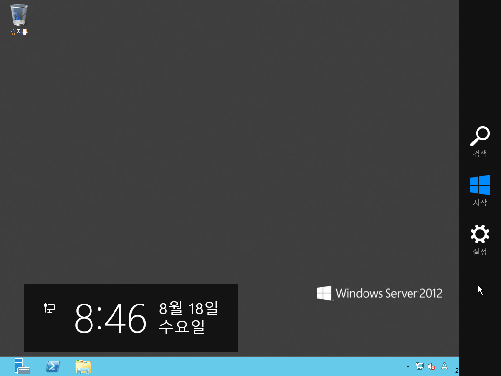 데스크톱 화면입니다. 단색 배경에 서버 2012 로고만 있고, 바탕화면 아이콘도 휴지통밖에 없습니다.