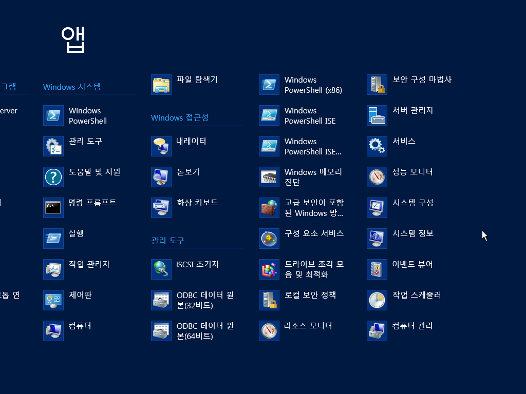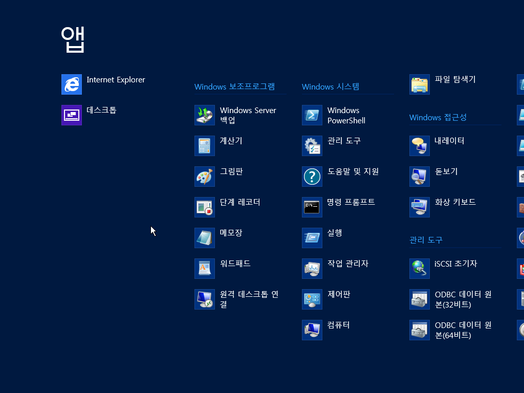 앱 목록입니다. 서버 기능에 집중해서 그런지 메트로 UI에서 기본으로 사용하는 앱은 별로 없는 것 같습니다.