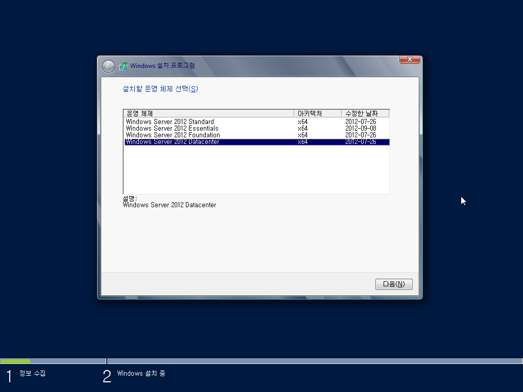 설치할 에디션을 선택합니다. 윈도우 서버 2012 데이터센터를 선택합니다.