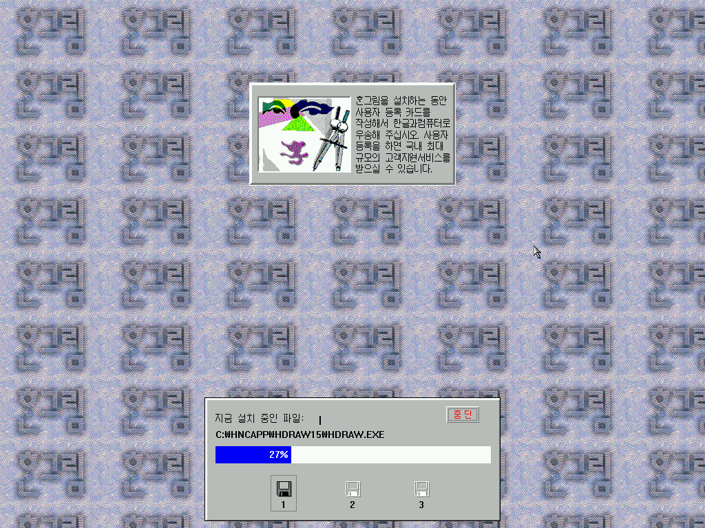 설치 CD를 넣고 먼저 한글 3.0b를 설치합니다. 설치를 누릅니다.