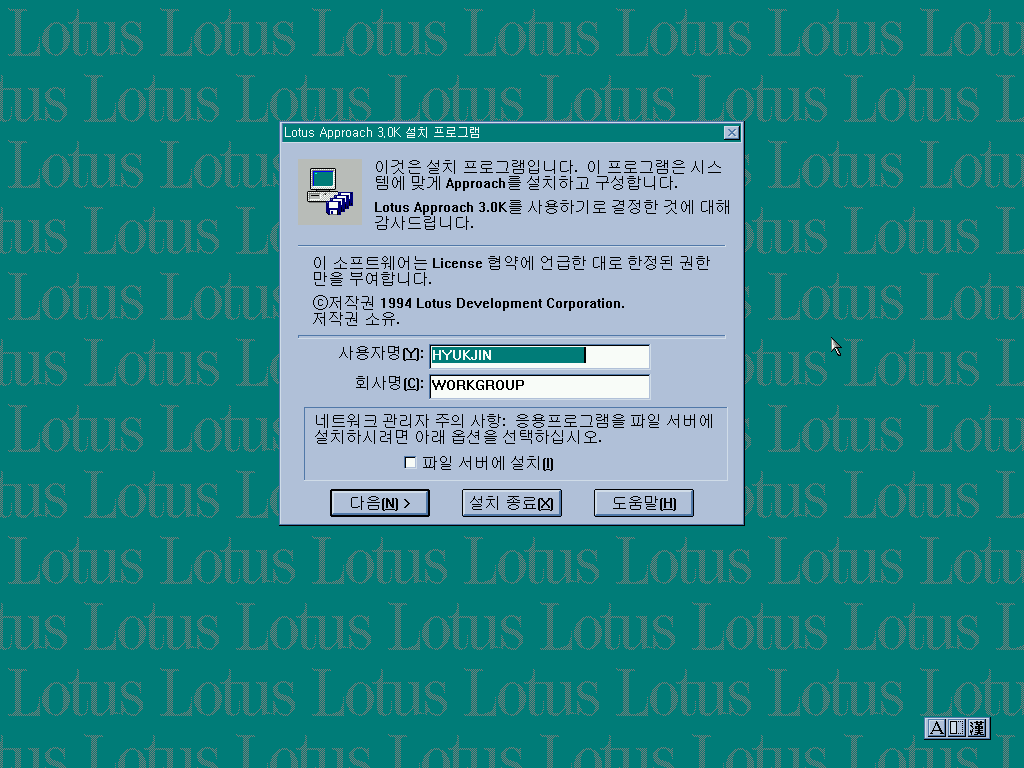 다음으로 로터스 프로그램들을 설치합니다. 로터스 1-2-3을 설치합니다.