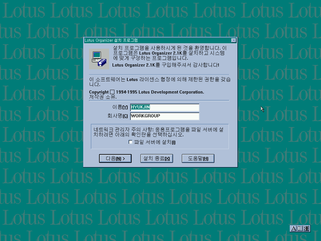 로터스 오거나이저 정보입니다. 일정을 작성하고 정리할 수 있는 프로그램입니다. 버전은 2.1입니다. 이 시절에는 로터스가 마이크로소프트 오피스에 밀리기 시작했지만, 한글오피스 패키지에 포함될 정도로 경쟁력이 있었던 시절이었습니다.