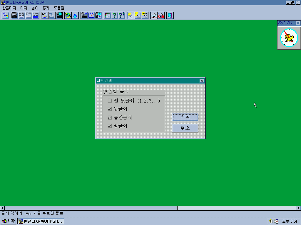 다음은 한글타자를 실행해보았습니다. 지금 한컴타자연습의 전신이죠. 초록색 배경이 매우 휑합니다.