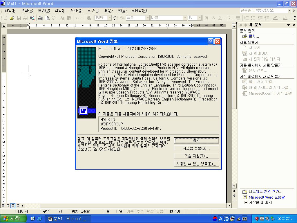 워드 정보입니다. 버전 2002입니다. 빌드 넘버는 10.2627.2625입니다. 정식판과 같습니다.
