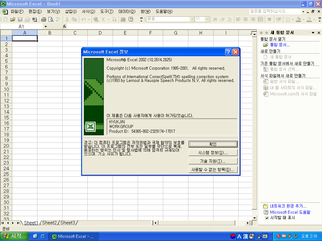 엑셀 정보입니다. 버전 2002입니다. 빌드 넘버는 10.2614.2625입니다. 정식판과 같습니다.