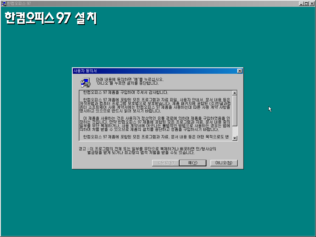 한컴오피스 97 설치를 시작합니다. 예를 누릅니다.