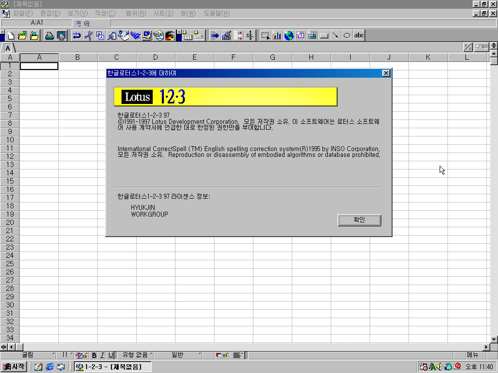 이제 로터스 프로그램들을 실행해보겠습니다. 먼저 로터스 1-2-3 97입니다. 한글오피스 96에서는 로터스 고유의 로고를 사용했는데, 한글에 번들로 끼워져 나오다보니까 한컴 로고를 사용하는 것 같습니다.