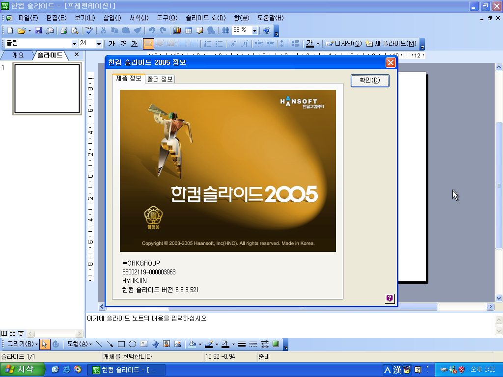 한컴슬라이드 2005 정보입니다. 이것도 로봇 로고가 있네요. 빌드 넘버는 6.5.3.521입니다.