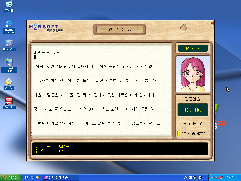 한컴타자연습을 실행해보았습니다. 워디안에서 2007까지 이어지는 버전입니다. 저는 한글 2005를 가장 많이 사용해서 타자연습도 이 버전을 가장 오래 사용해본 것 같네요.