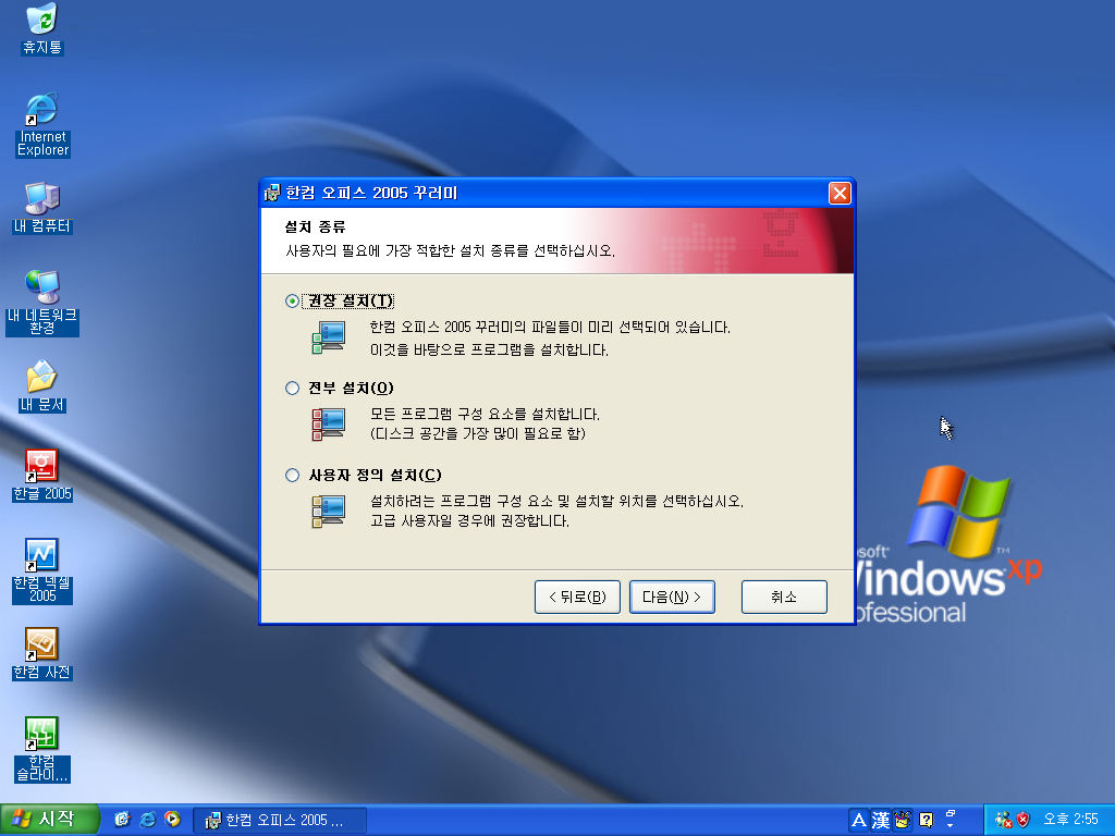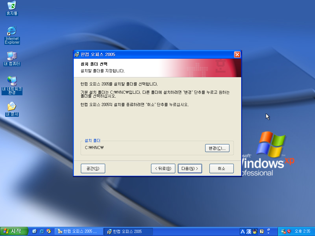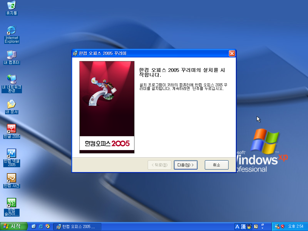 뒤이어 한컴오피스 2005 꾸러미를 설치합니다. 다음을 누릅니다.