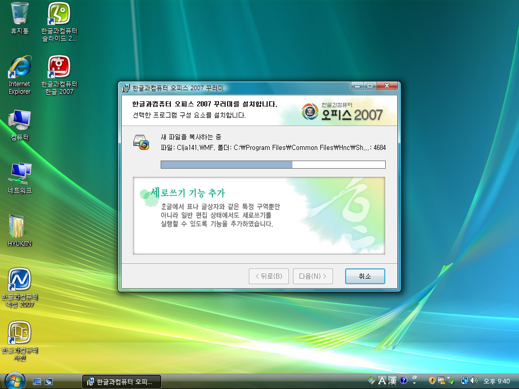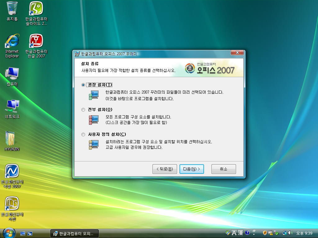 한글과컴퓨터 한컴오피스 2007을 설치해보았습니다. 한컴오피스 2007은 한글 2007을 포함한 한글 오피스 프로그램 패키지로서, 한글 2007부터 그래픽 인터페이스가 향상된 만큼 상당히 무거워진 버전입니다.