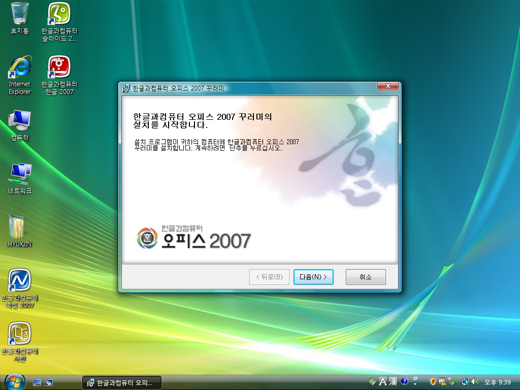 이어서 한컴오피스 2007 꾸러미 설치를 시작합니다. 다음을 누릅니다.