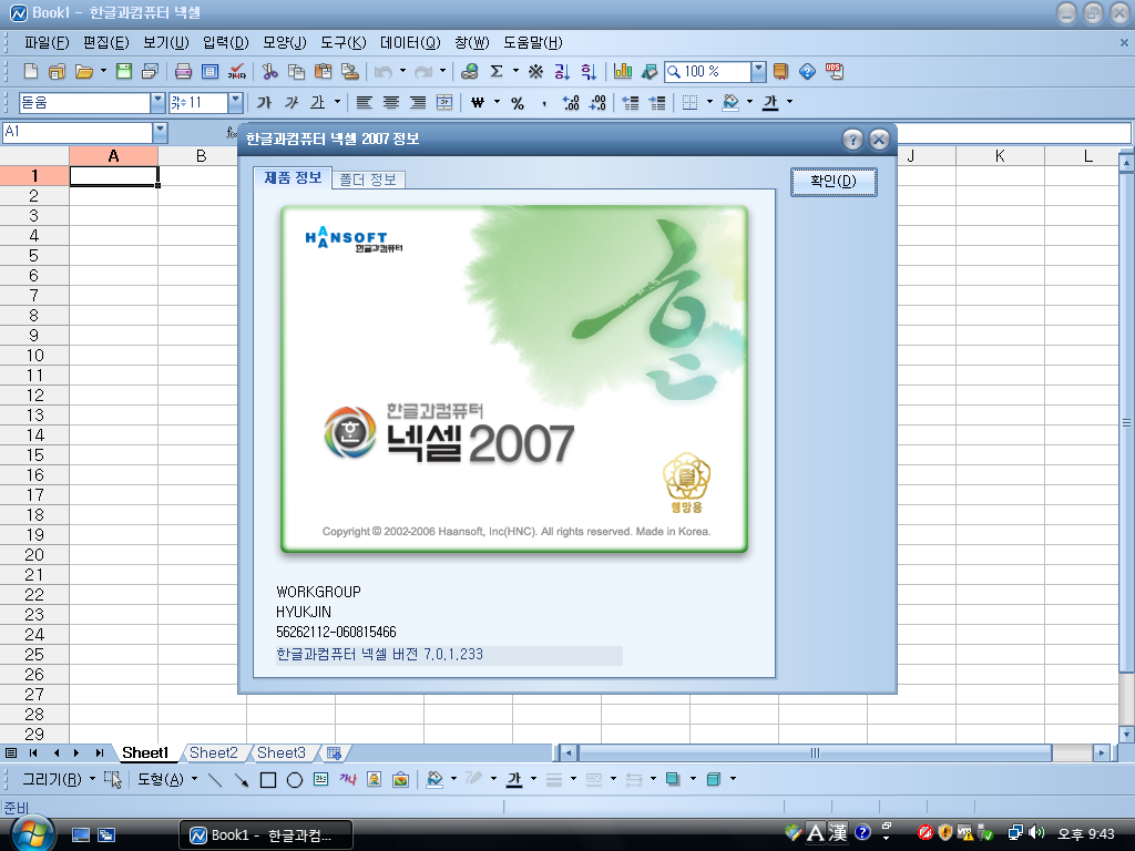 넥셀 2007 정보입니다. 빌드 넘버는 7.0.1.233입니다.