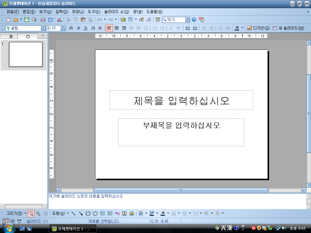 슬라이드 2007의 모습입니다. 프레젠테이션 프로그램이라 파워포인트와 똑같습니다.