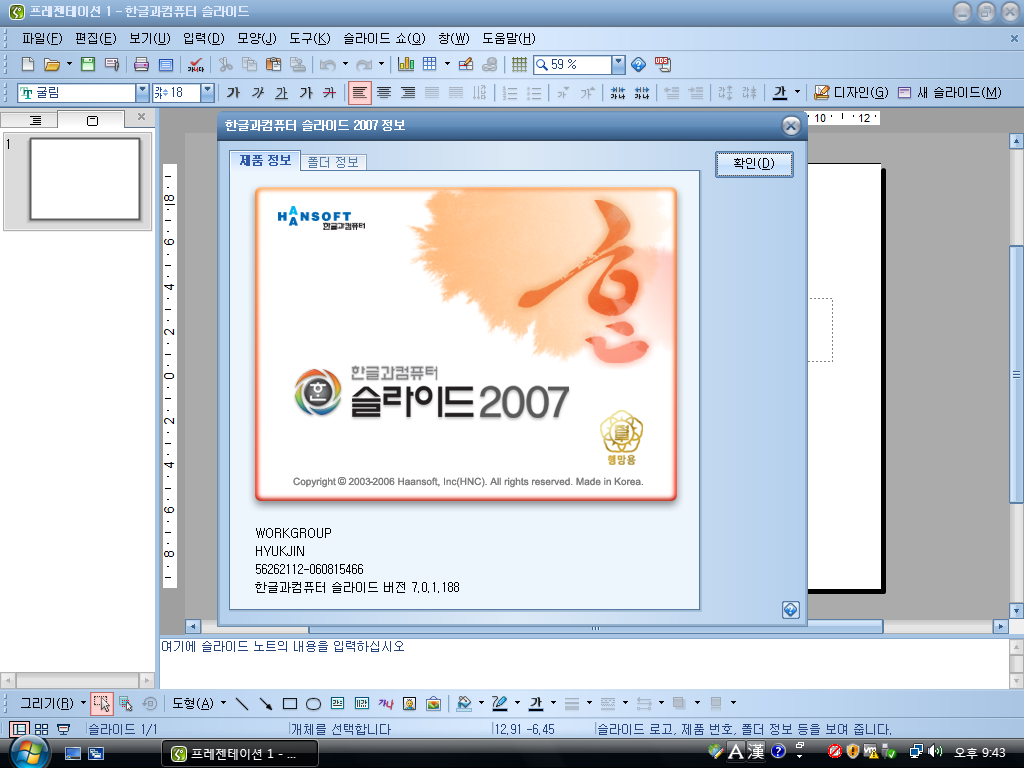 슬라이드 2007 정보입니다. 빌드 넘버는 7.0.1.188입니다.
