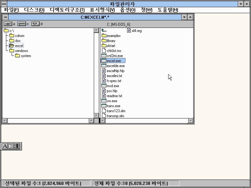 하드에 excel 디렉토리를 만들어놓고 파일을 복사해서 실행해봤습니다. 윈도우 3.1에서 작동합니다.