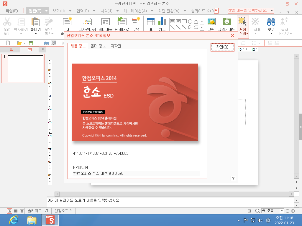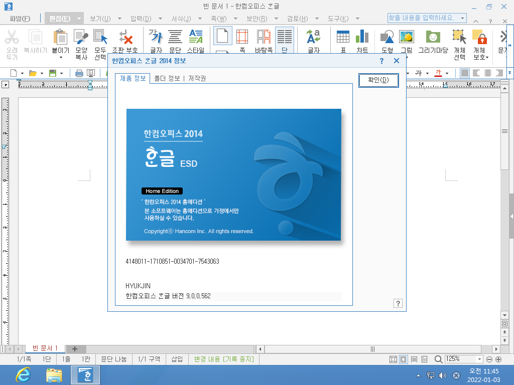 한글 2014 정보입니다. 가정용이자 온라인 전용 제품인 ESD입니다. 빌드 넘버는 9.0.0.562입니다.