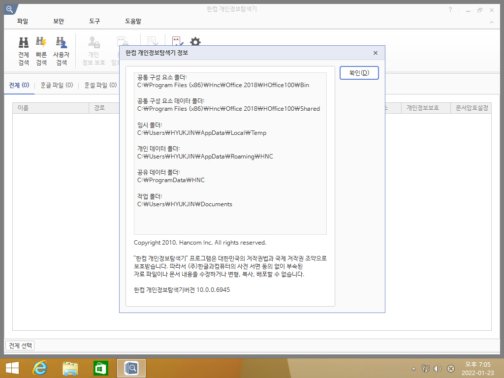 한컴 개인정보탐색기 정보입니다. 얘도 로고가 안나오는군요. 빌드 넘버는 10.0.0.6945입니다.