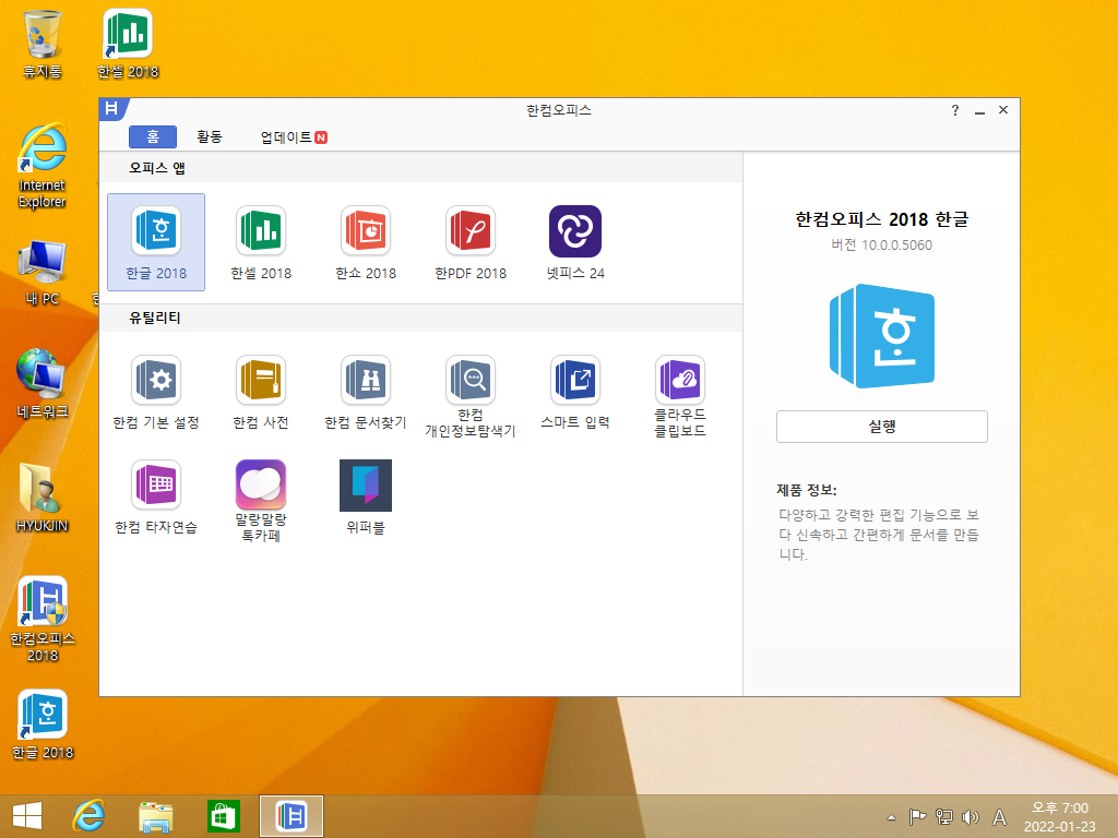 한컴오피스 2018을 실행하면 이렇게 한컴오피스의 모든 프로그램을 보여줍니다.