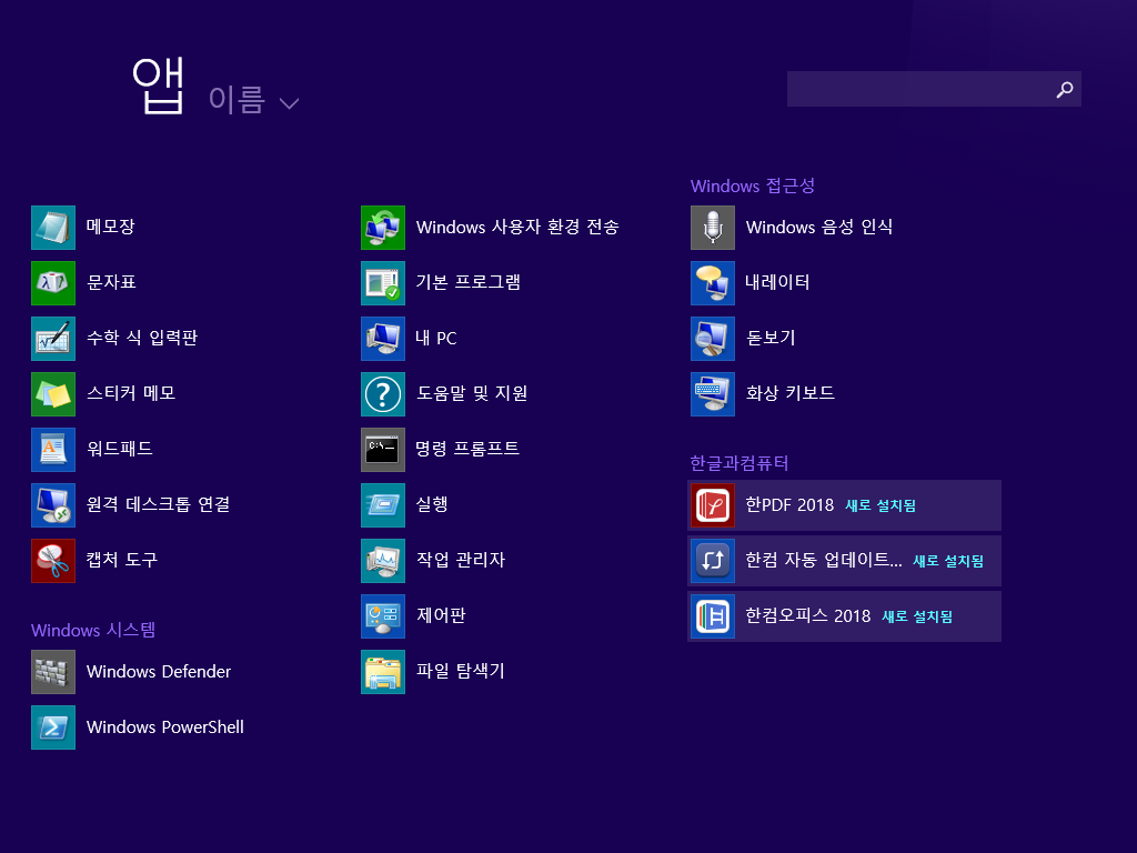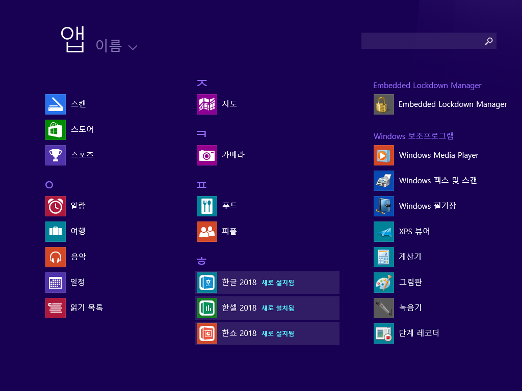 앱 목록을 열어보았습니다. 한글 2018 외에도 한셀 2018과 한쇼 2018이 설치되었습니다.