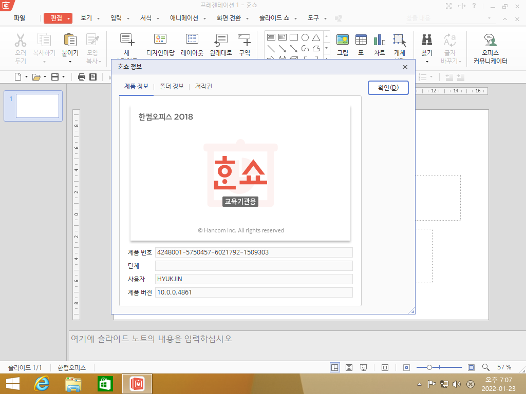 한쇼 2018 정보입니다. 빌드 넘버는 10.0.0.4861입니다.