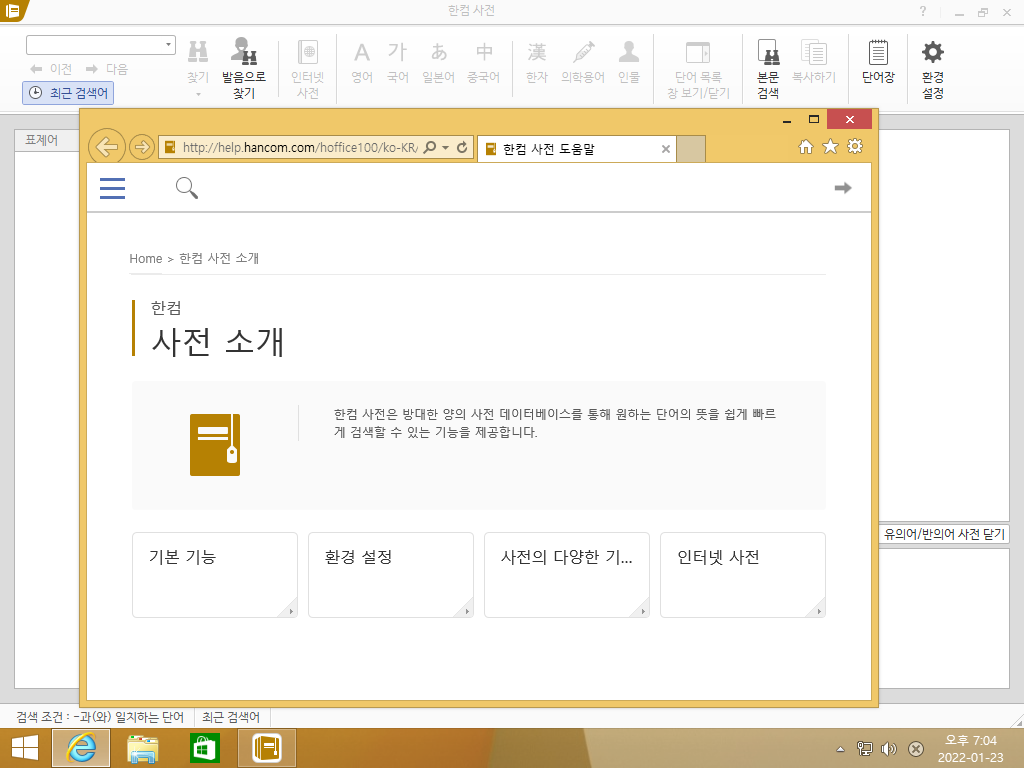 한컴 사전 도움말입니다. 도움말의 모습이 좀 바뀌었네요.