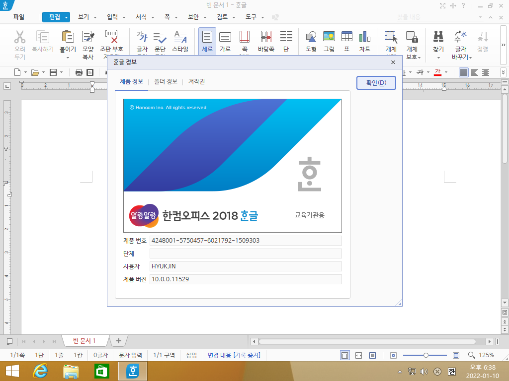 업데이트 한 이후의 한글 2018 정보입니다. 로고가 바뀌었으며, 빌드 넘버가 10.0.0.11529로 올라갔습니다.