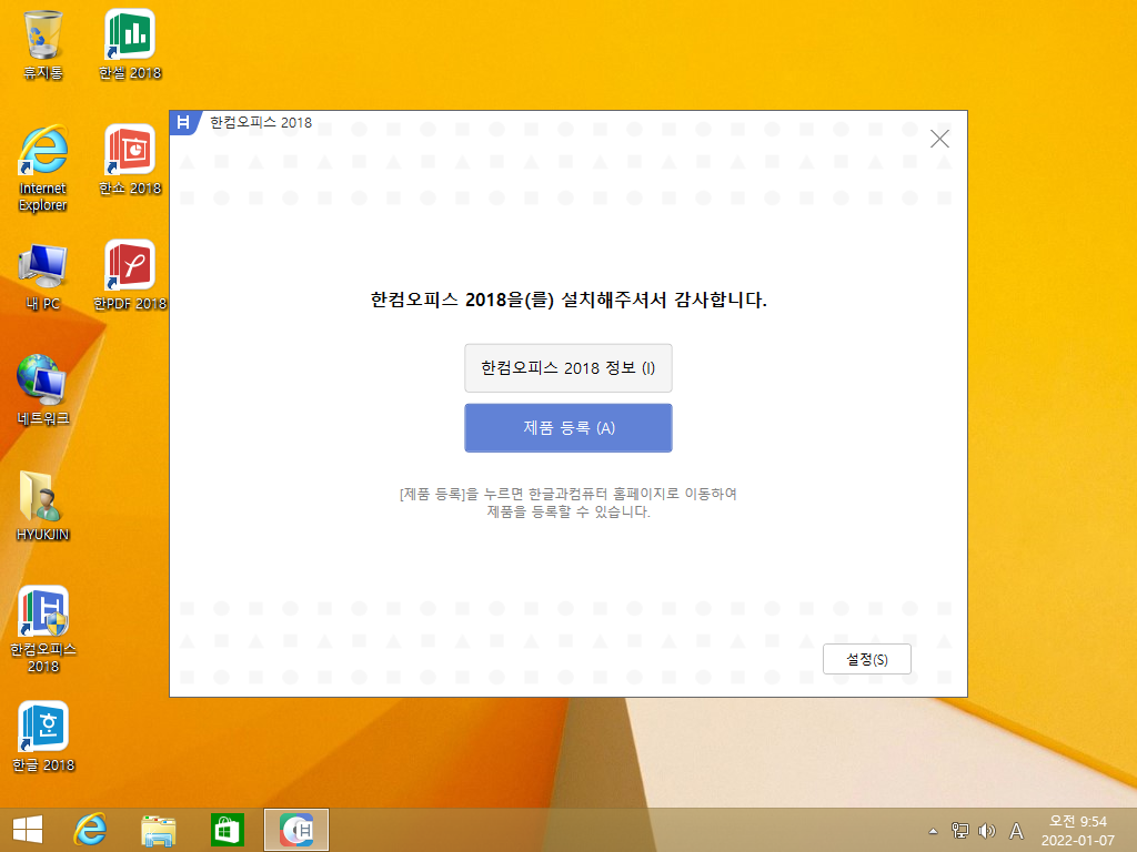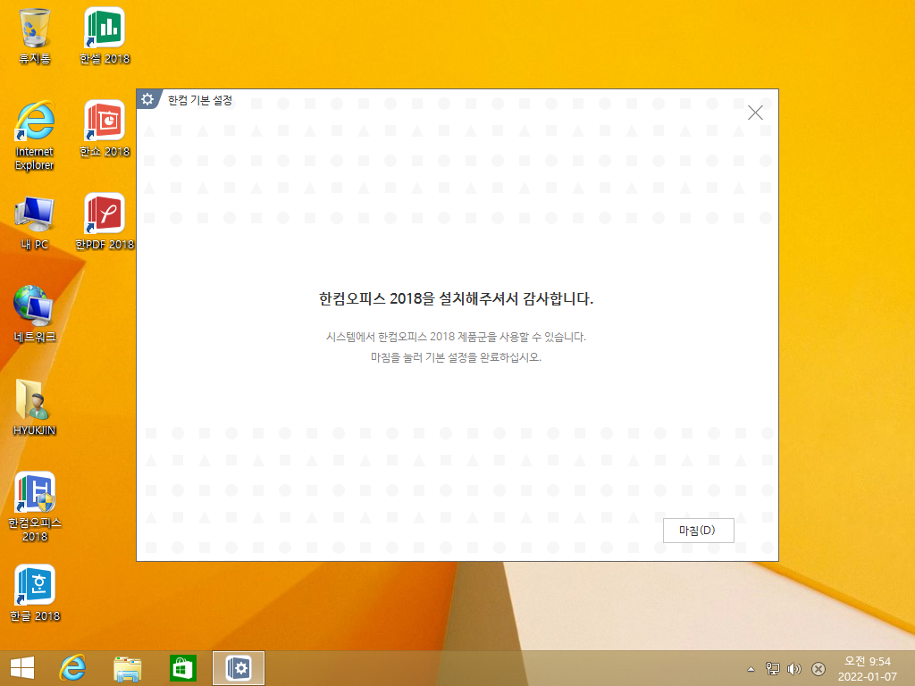 한컴오피스 2018이 설치되었습니다. 설정을 누릅니다.