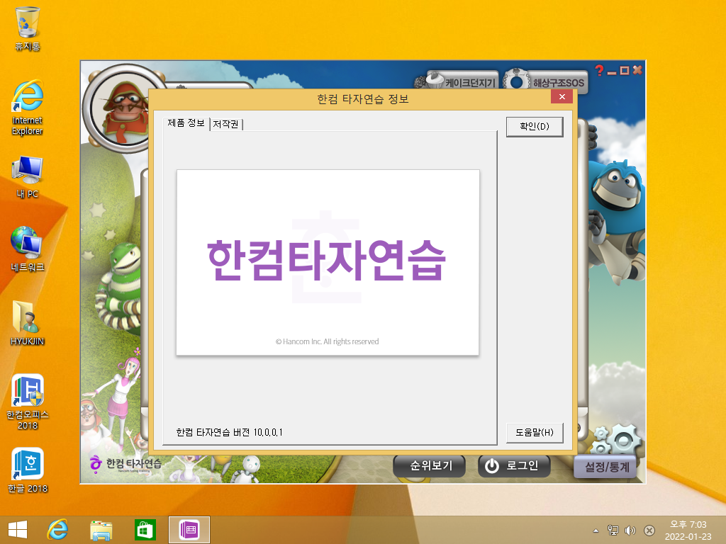 한컴타자연습 정보입니다. 빌드 넘버는 10.0.0.1입니다.
