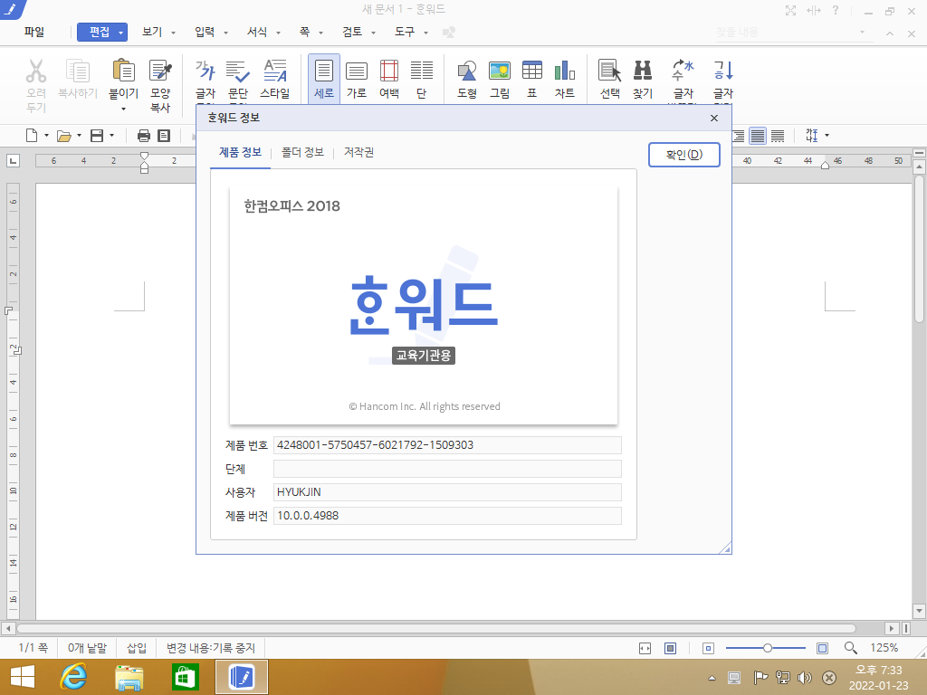 한워드 2018 정보입니다. 빌드 넘버는 10.0.0.4988입니다.