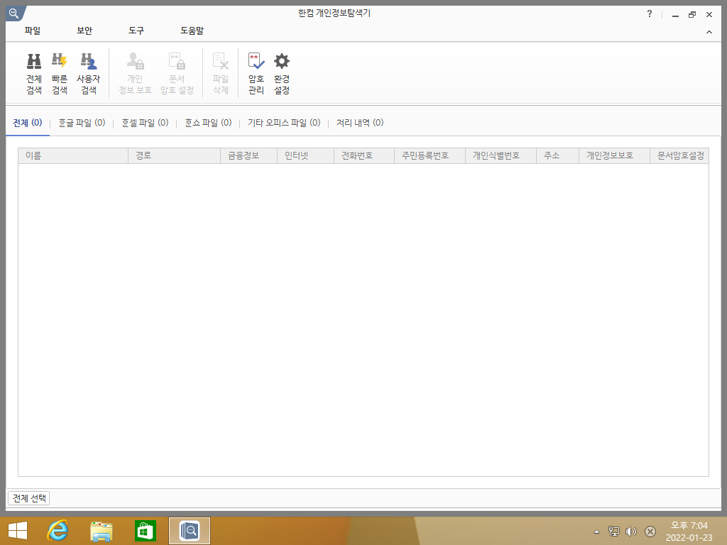 한컴 개인정보탐색기의 모습입니다. 문서에 암호를 걸어 보안을 강화할 수 있습니다.