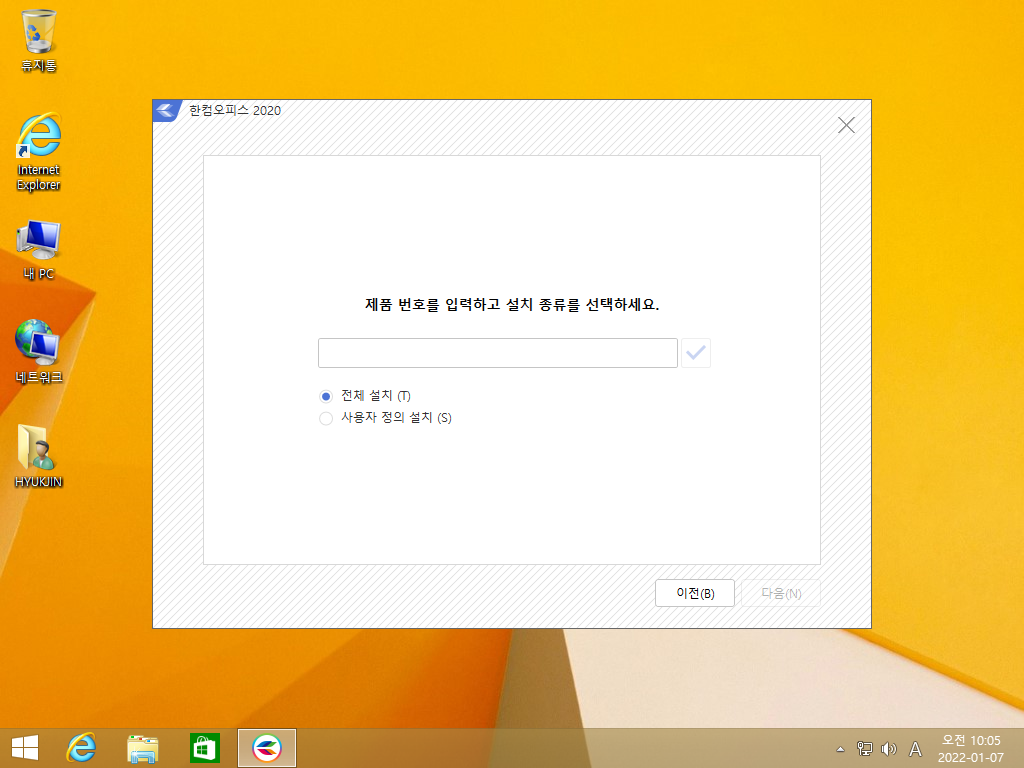 제품 번호를 입력하고 설치 종류를 선택한 후 다음을 누릅니다.