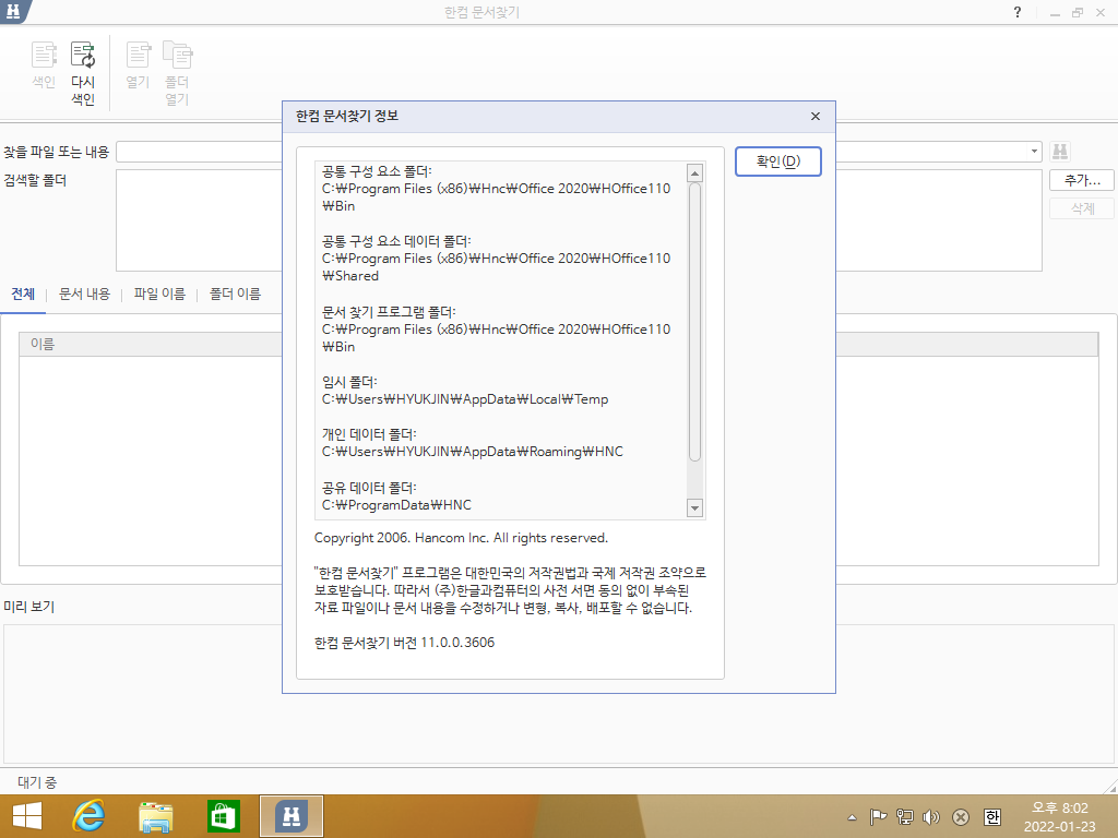 한컴 문서찾기 정보입니다. 역시 설치 경로가 나오고, 빌드 넘버는 11.0.0.3606입니다.