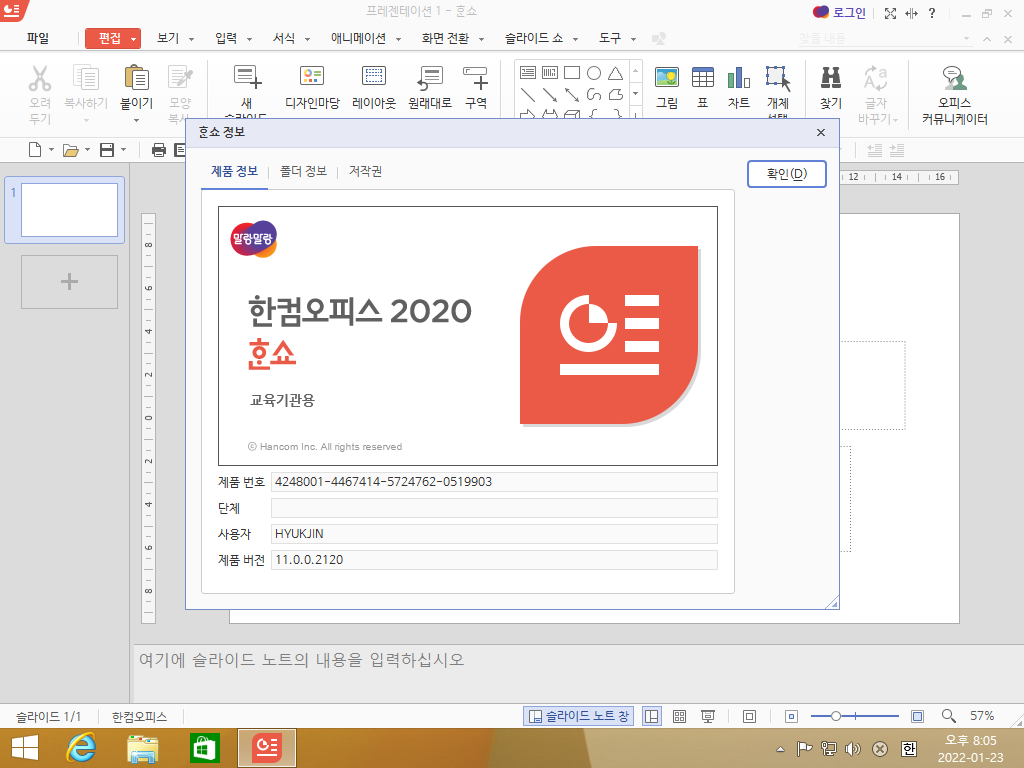 한쇼 2020 정보입니다. 빌드 넘버는 11.0.0.2120입니다.