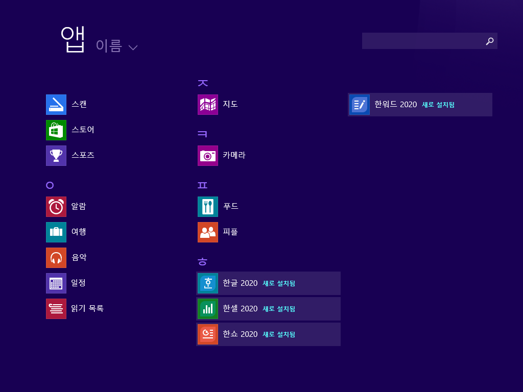 앱 목록을 열어보았습니다. 한글 2020 외에도 한셀 2020, 한쇼 2020이 설치되어 있습니다.
