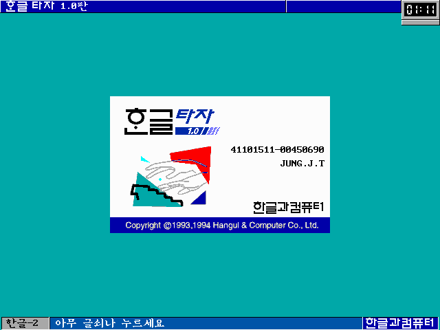 한글타자 1.0 정보입니다. 한글 타자 1.0판이라고 나옵니다. 시리얼 넘버도 나오고, JUNG. J. T.라는 이니셜을 가진 사람이 사용했던 파일 같습니다. 정보가 그대로 남아있네요. 손 모양의 로고는 한글 2.1의 로고와 똑같습니다.