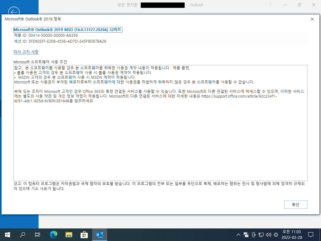 아웃룩 정보입니다. 버전 2019입니다. 빌드 넘버느 16.0.13127.20266입니다.