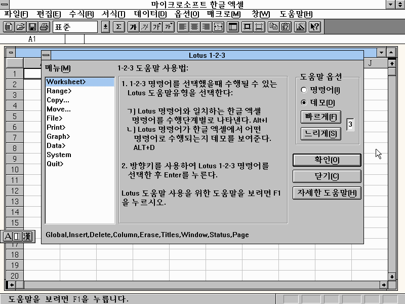같은 스프레드시트 프로그램이었던 로터스 1-2-3의 명령어와 단축키를 사용할 수 있었습니다. 로터스도 꽤나 잘나가는 스프레드시트 프로그램이었는데, 마이크로소프트의 엑셀에 밀리고 말았죠.. 엑셀이 로터스의 각종 기능들을 베껴온 것도 한몫 했지만요.