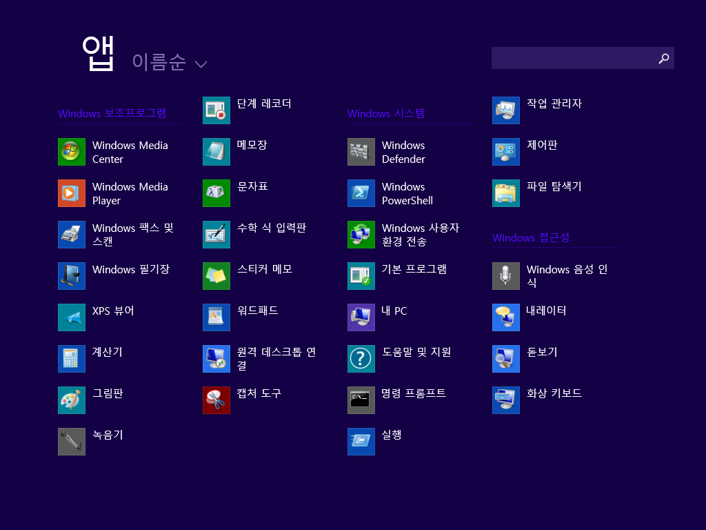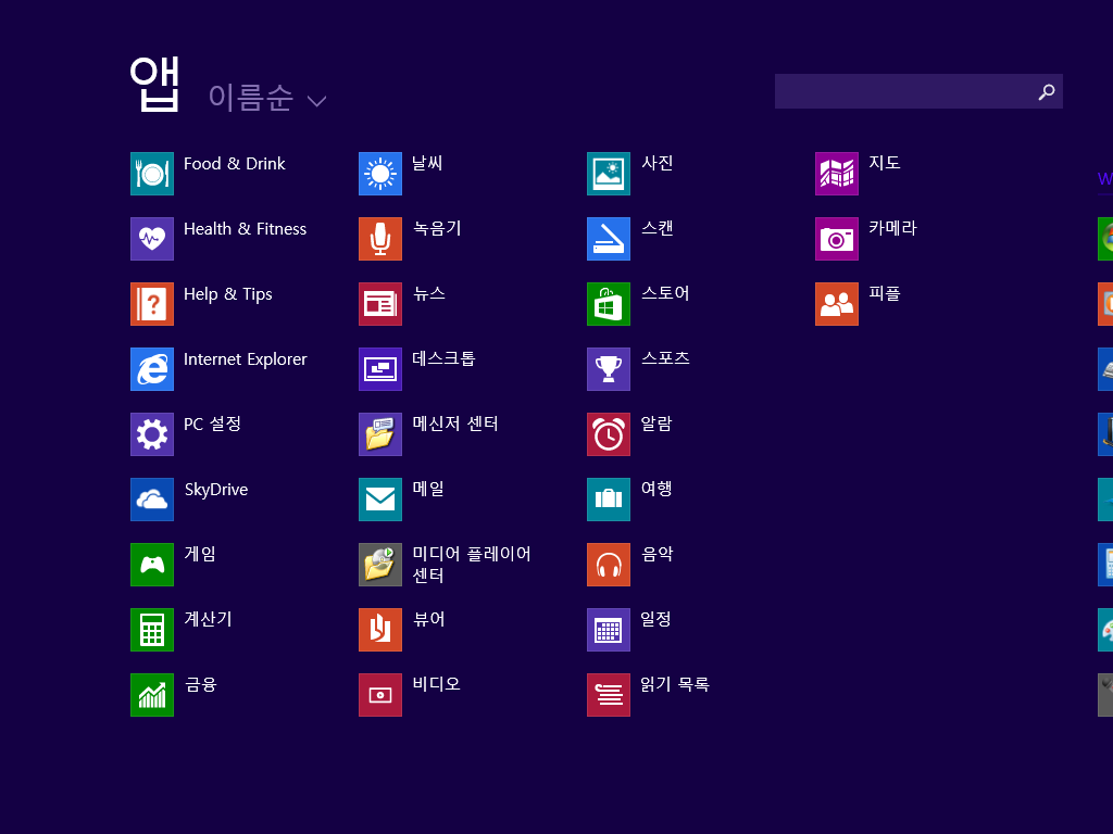 앱 목록입니다. 이렇게 왼쪽에는 메트로 UI 전용 앱들이 있습니다. 한글화가 덜 된 애들이 보이는군요.
