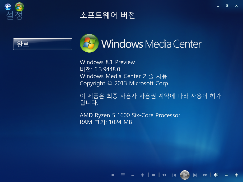 미디어 센터 정보입니다. 빌드 넘버는 6.3.9448.0입니다. 얘는 뭐 시간이 가도 UI가 변하질 않네요.
