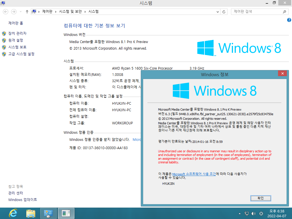시스템 등록 정보입니다. 미디어 센터를 포함한 윈도우 8.1 프로 K 프리뷰 빌드 9448입니다. 빌드 넘버는 6.3.9448입니다.