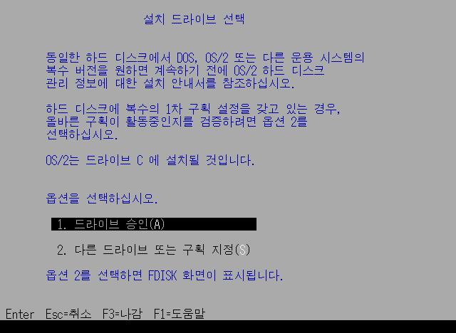 OS/2를 설치할 드라이브를 선택합니다. 기본값은 C드라이브입니다. 1번 드라이브 승인을 선택합니다.