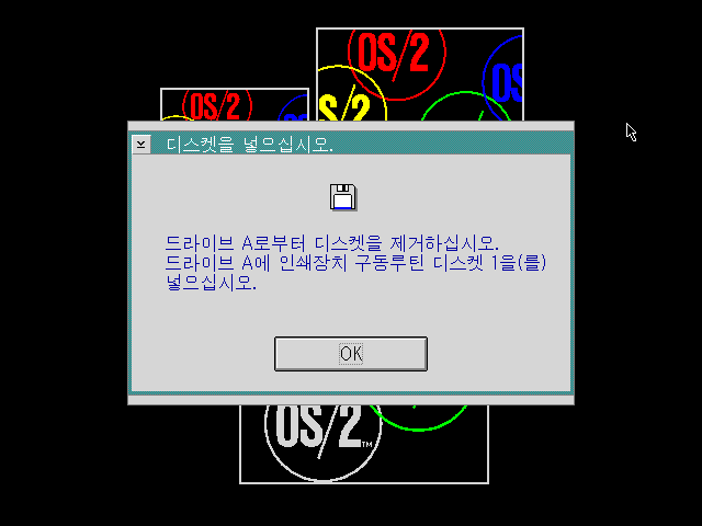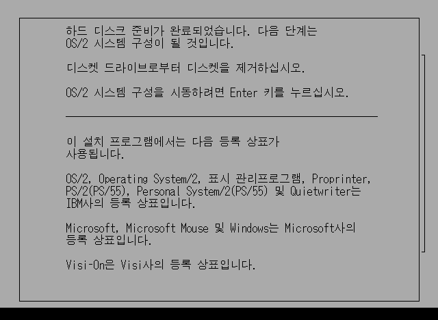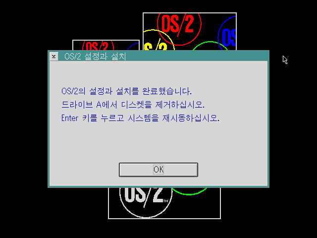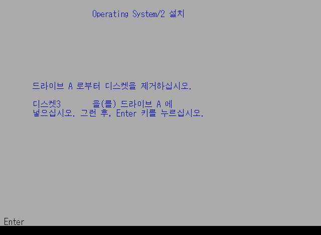 OS/2의 설정과 설치를 모두 완료했습니다. 드라이브에서 디스켓을 제거하고 엔터를 누릅니다.