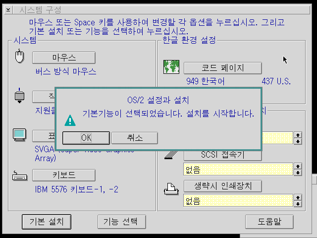 기본 기능 선택이 완료되었습니다. OK를 누르면 설치 과정이 계속됩니다.