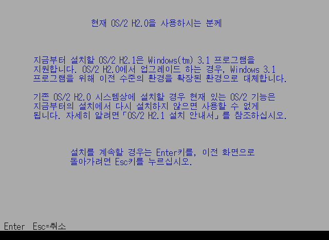 기존의 OS/2 H2.0 사용자들을 위한 안내문입니다. 윈도우 3.1도 지원한다고 나오네요. 이 화면을 통해 OS/2 H2.0 버전 또한 존재했다는 사실을 알 수 있습니다. 아쉽지만 실제로 파일이나 실물을 구하지는 못했네요.