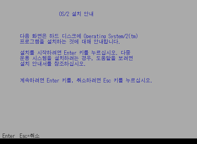설치 안내 창이 뜹니다. 하드 디스크에 OS/2를 설치하려면 엔터를 누릅니다.