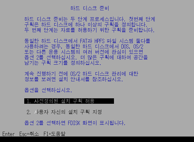OS/2를 설치할 하드 디스크를 준비합니다. 1번 사전정의된 설치 구획 허용을 선택합니다.