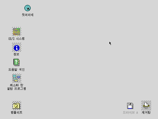 바탕화면입니다. GUI를 채택하여 바탕화면과 아이콘이 있지만, 시작 표시줄은 없는 것이 꼭 윈도우 3.1 같습니다. 기본 배경화면은 칙칙한 회색이네요. 윈도우와는 다른 아이콘 이름들이 눈에 띕니다.