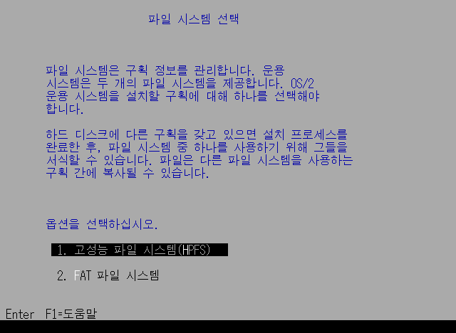 디스크의 파일 시스템을 선택합니다. 1번 고성능 파일 시스템 (HPFS)를 선택합니다. 아마 HPFS는 윈도우의 NTFS에 대응하는 파일 시스템 방식이겠죠? FAT 또한 그대로 사용하고 있습니다.